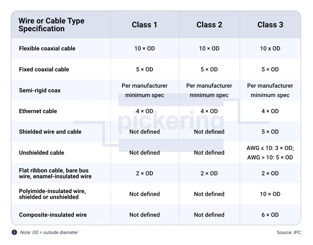 IPC/WHMA-A-620E organises bend-radius acceptance by wire/cable type and product class — Class 1 for general-purpose electronics, Class 2 for dedicated-service products where continued performance is expected, and Class 3 for high-reliability applications where failure is not acceptable. That matters because some bend radius requirements apply across all classes, while others are only established for Class 3 [15].