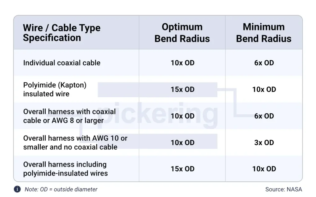 NASA states that its Table 7-1 values apply to bending that occurs in the installed interconnecting harness or cable [1]. The table is useful because it distinguishes an optimum bend radius from the minimum bend radius. In practice, that means design to the optimum when you can and treat the minimum as the lower limit, not the target.